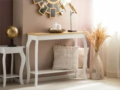 Erittäin monikäyttöinen konsolipöytä sopii tyylinsä puolesta mihin tahansa tilaan, makuuhuoneesta eteiseen. Tyylikkään peililasiviimeistelyn ansiosta se näyttää hyvältä etenkin moderneissa ja glamour-tyylisissä sisustuksissa, heijastaen valoa kauniisti ja laajentaen tilaa visuaalisesti. Kaksi käytännöllistä laatikkoa tarjoavat paljon tilaa erilaisille tarpeellisille esineille. Kestävästä MDF-levystä valmistettu konsolipöytä säilyttää täydellisen ulkonäkönsä pitkään. Koristele kaluste erilaisilla koristeilla tai käytä sitä makuuhuoneen kampauspöytänä.